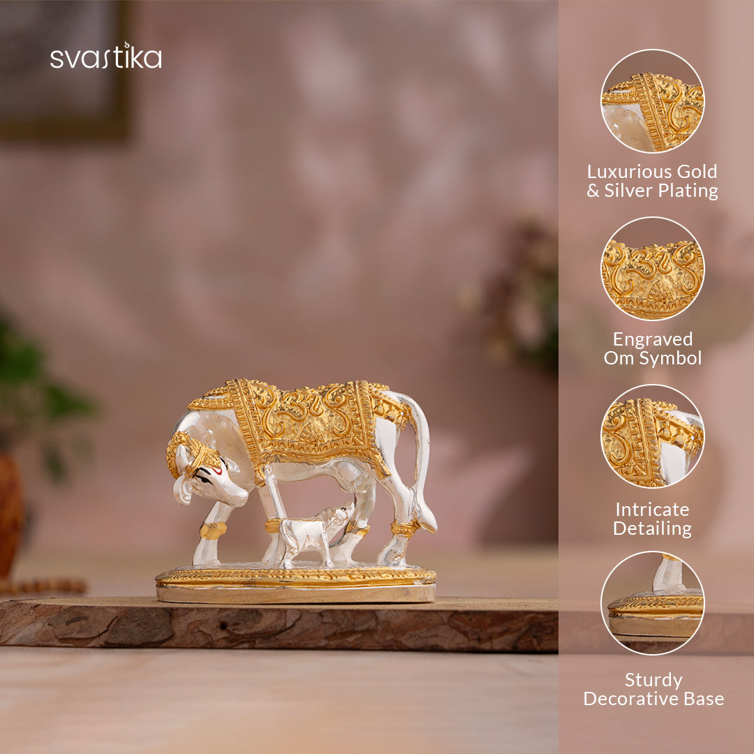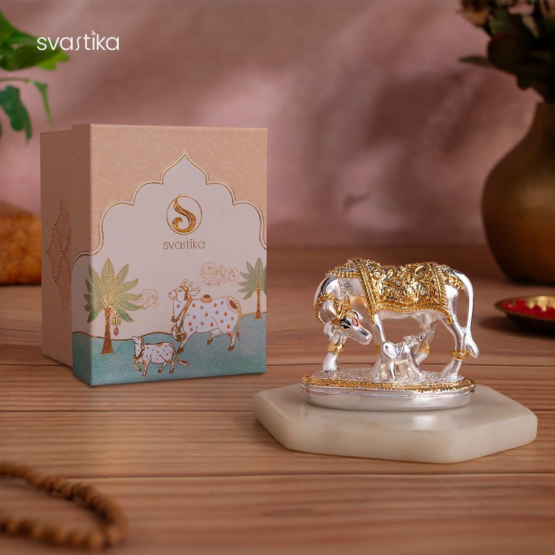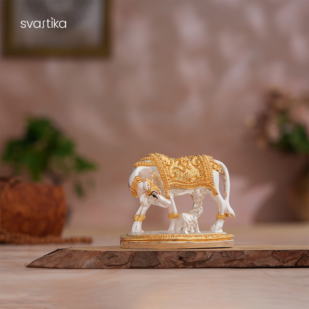 The Kamadhenu cow is considered an extraordinary cow, also known as the "Mother of all cows", "Cow of Plenty" and "Space Cow". The Kamadhenu cow and her calf "Nandini" also called as Gomatha statue have attracted great interest in Indian history due to their success in attracting surrounding farms and bringing prosperity and well-being. It is believed that placing a Kamadhenu cow statuette in a house, especially one that also has a calf, Nandini, brings good fortune, happiness and positive household status.